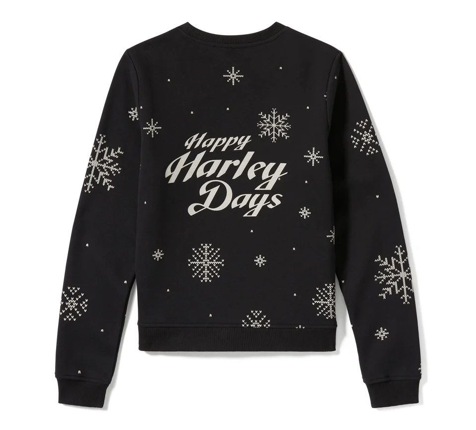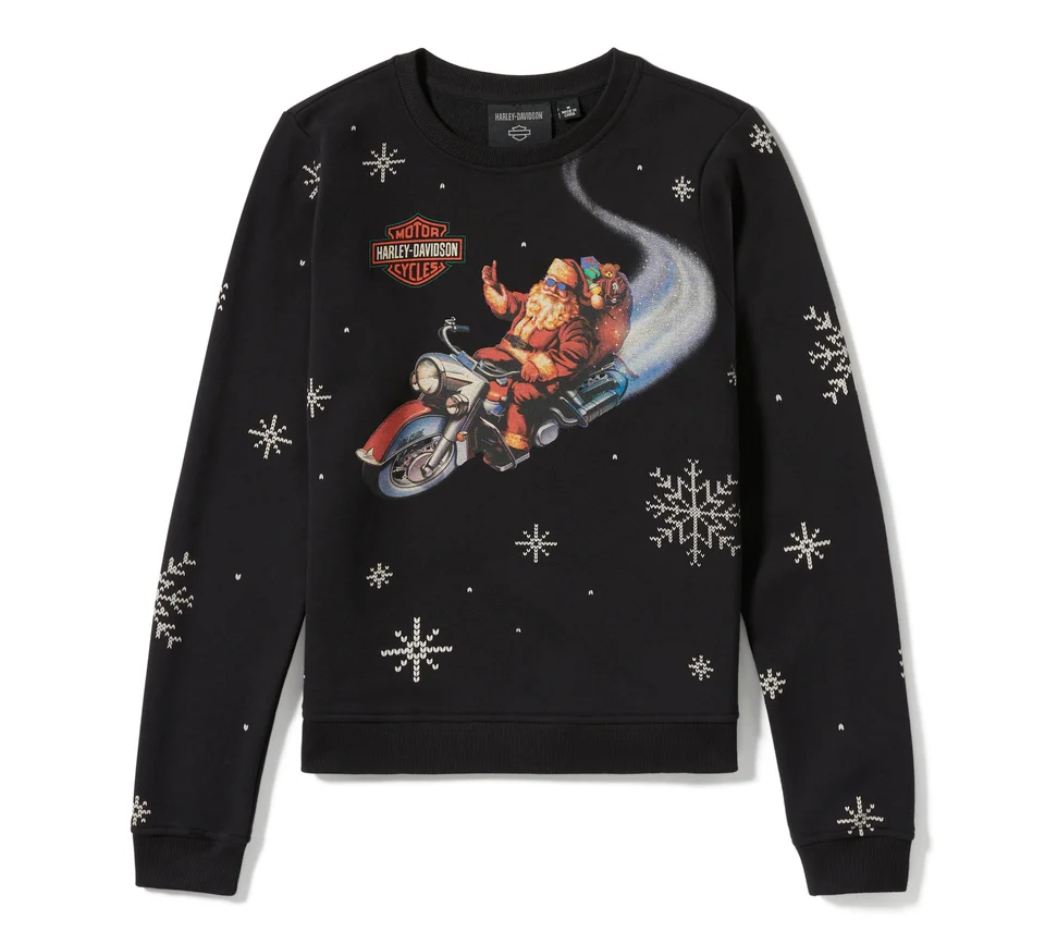 Scegli uno stile motociclistico-festivo quest’anno. Questa felpa girocollo da donna è pensata per le lunghe giornate invernali, ed è realizzata in pile misto cotone/poliestere con finiture in costina che non perdono la forma. La felpa è impreziosita da alcune immagini realizzate appositamente, complete della slitta di Babbo Natale in versione (aggiornata)! Non mancherà di riscuotere successo durante le riunioni con la tua famiglia motociclistica, quindi affrettati e ordinala subito.