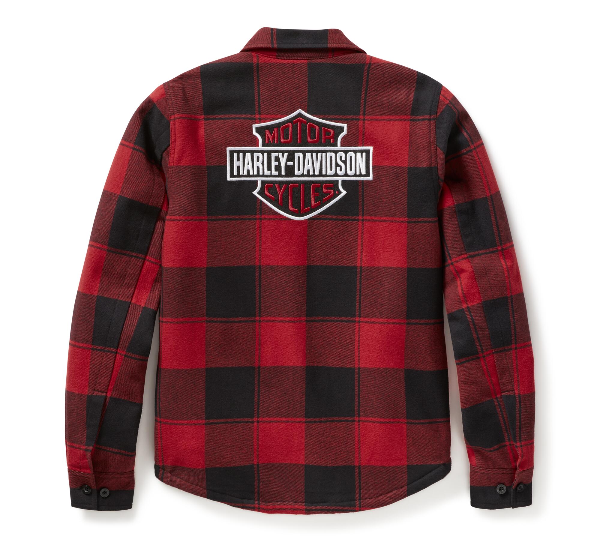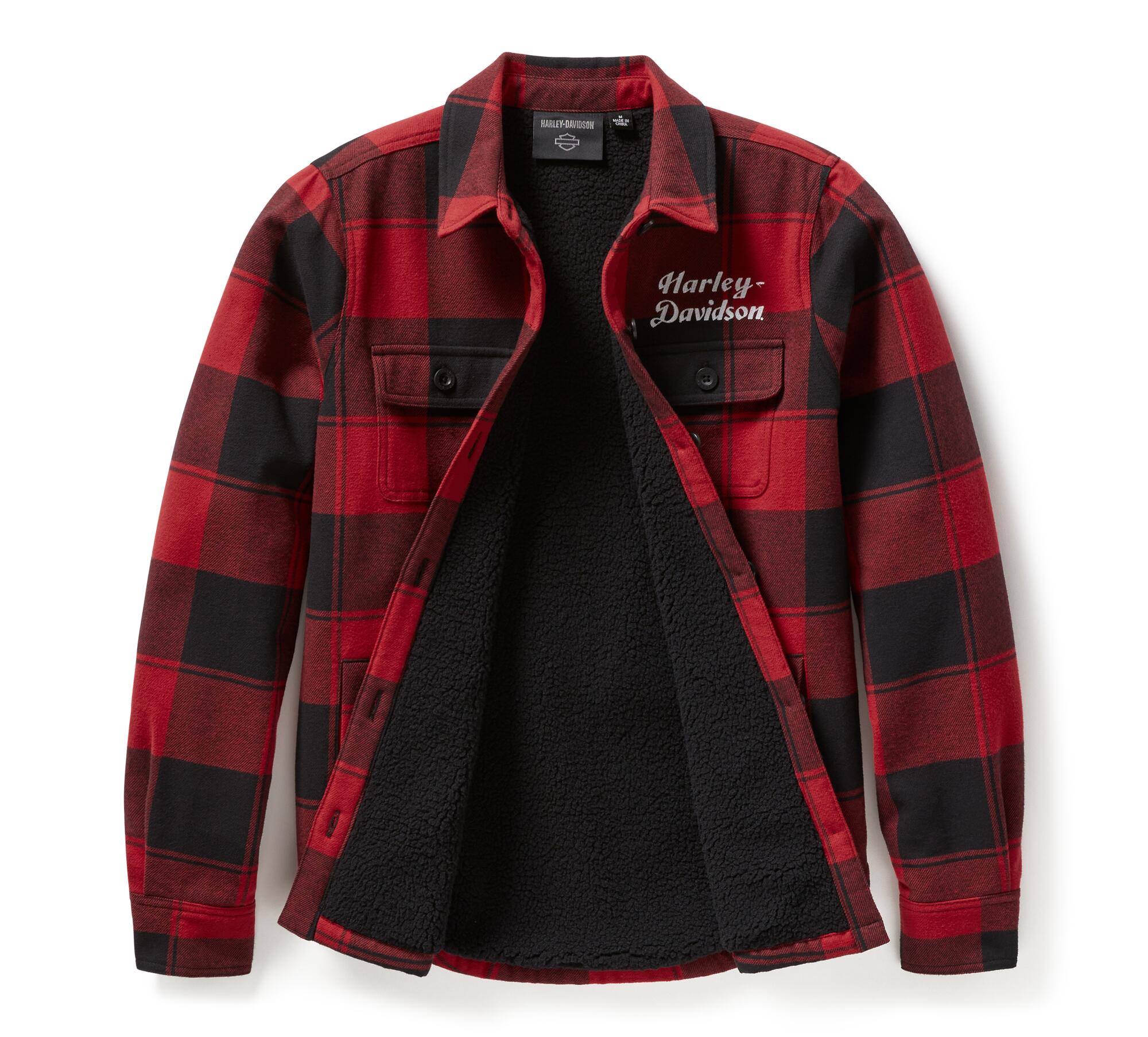 Giacca-camicia da donna realizzata in pesante tessuto twill di cotone 100% tinto in filo a quadri rossi e neri, la fodera è in sherpa di poliestere 100% e in twill di poliestere trapuntato con imbottitura leggera sulle maniche. Chiusura con bottoni sul davanti e ai polsi. Patte sulle maniche con automatici nascosti. Tasche sul petto con patta e bottone, tasche scaldamani a filetto con chiusura a automatici nascosti. Colletto con automatici nascosti, orlo a coda di rondine. Grafica: ricamo a punto catenella e applicazione in feltro ricamata applicata a punto raso.