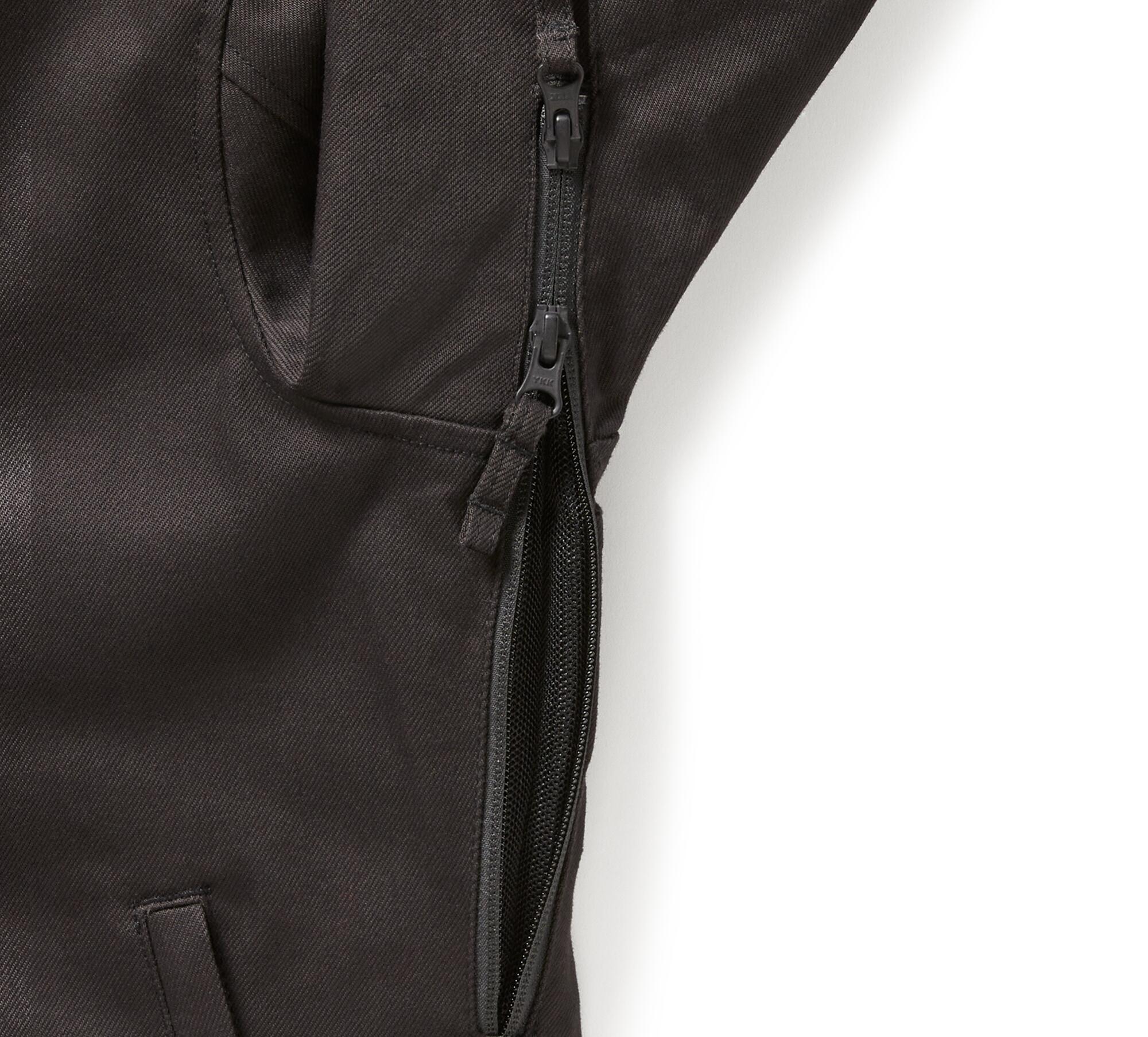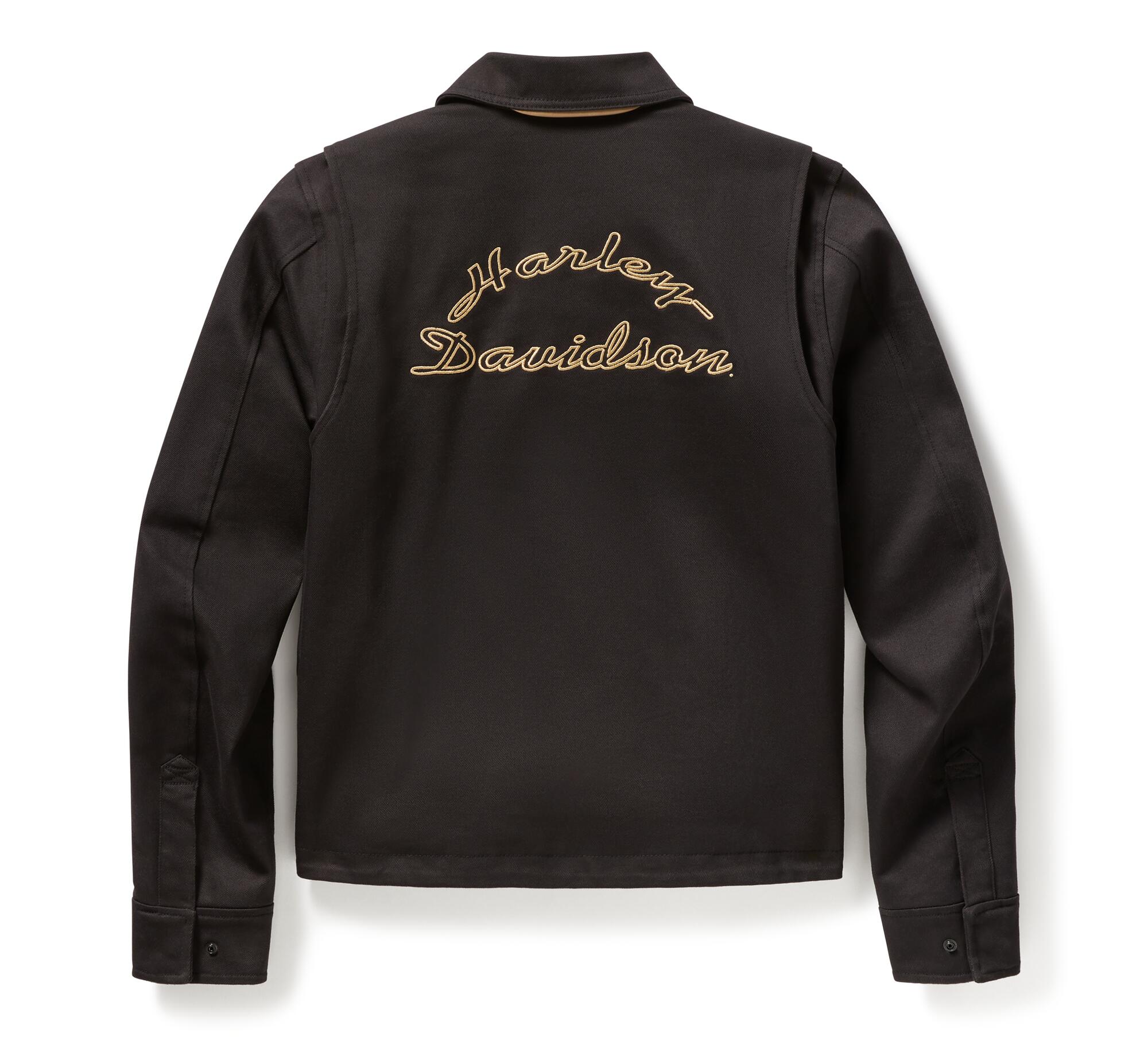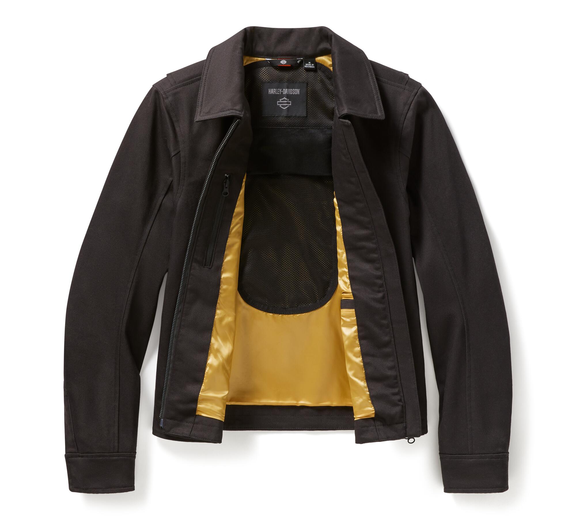 Giacca da donna in tessuto Harley-Davidson aperture di ventilazione con cerniera sotto le ascelle per il flusso d’aria. Vestibilità e mobilità: parte posteriore Action. Maniche precurvate. Materiali: 78% cotone, 16% nylon, 5% poliestere, 1% elastan , colore nero con grafica oro, twill elasticizzato pesante. Fodera in raso 100% nylon. Chiusura: Chiusura: cerniera anteriore a due vie. Polsini regolabili con bottoni automatici. Tasche: tasche scaldamani con cerniera. Tasca verticale sul petto con chiusura a cerniera. Una tasca interna nascosta e una tasca interna con cerniera. Caratteristiche: il DPI certificato HD® CE è testato e soddisfa i requisiti di resistenza all’abrasione, allo strappo e alle cuciture. Include armatura D3O® Ghost™ certificata EN 1621-1 su spalle e gomiti (98104-22VR e 98103-22VR). La tasca posteriore per l’armatura si adatta all’armatura posteriore D3O® Viper certificata EN 1621-2 (98317-25VR, venduta separatamente). Profilo in materiale riflettente 3M™ Scotchlite™ sul retro del colletto. Dettagli di design: Dettagli di design: Silhouette squadrata. Fodera a contrasto. Colletto nascosto con bottoni automatici. Grafica: Grafica: Ricamo in rilievo. Caratteristiche aggiuntive: Certificazione: Certificato secondo EN 17092-4:2020.
