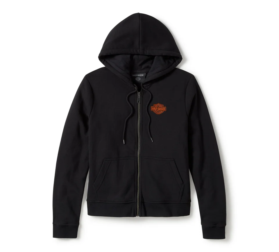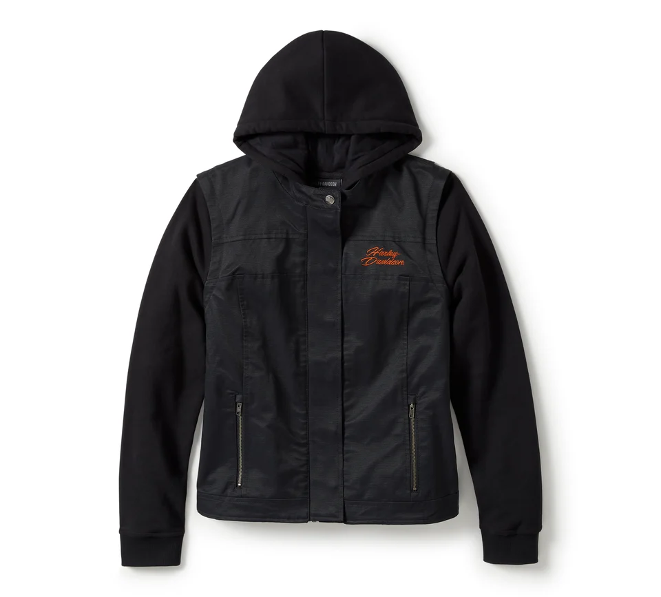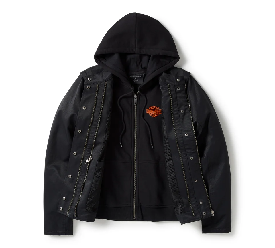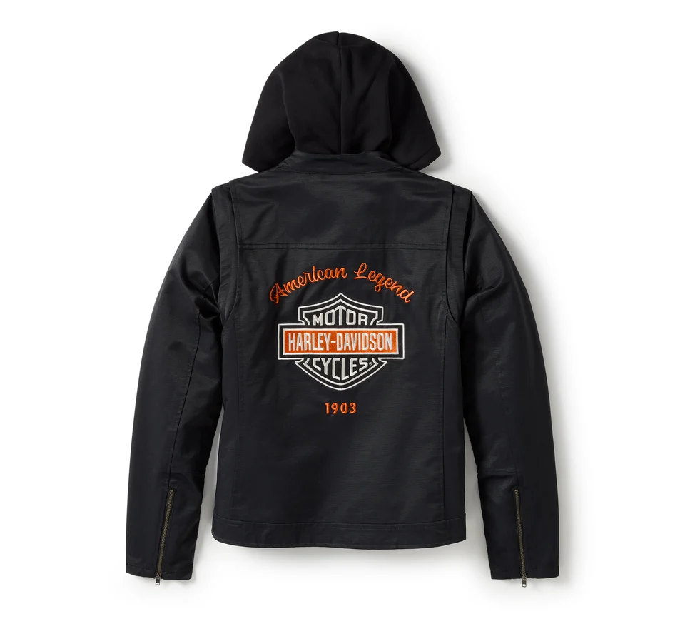 Stile, comfort e versatilità migliorati convergono in questa nuovissima giacca in tessuto Miss Enthusiast 3-in-1. Lo strato esterno è realizzato in tessuto oxford cotone/nylon pesante. Ora le maniche sono rimovibili, in modo da poterlo indossare come un gilet, e inoltre è dotato di colletto con linguetta regolabile. Abbiamo anche ammodernato lo hoodie, dotandolo di una cerniera aggiuntiva che si fissa alla giacca/gilet e di una coulisse che si ripone dentro il cappuccio, in modo da non svolazzare sotto l’attrezzatura da moto. Puoi indossare la giacca da sola, il gilet da solo, oppure solo la felpa. In alternativa, puoi combinarli assieme. In ogni caso, questo capo diventerà qualcosa di irrinunciabile per ogni occasione motociclistica. I capi sfoggiano le classiche grafiche ricamate H-D, per uno stile sempre inimitabile. Acquistala subito prima che le scorte finiscano.