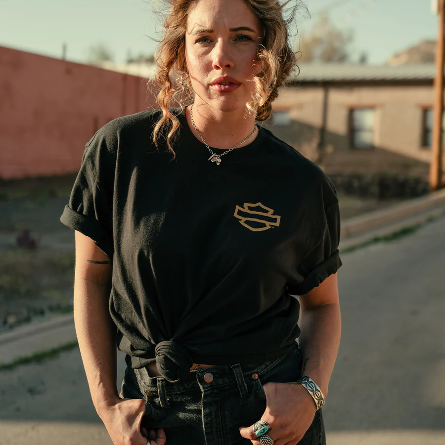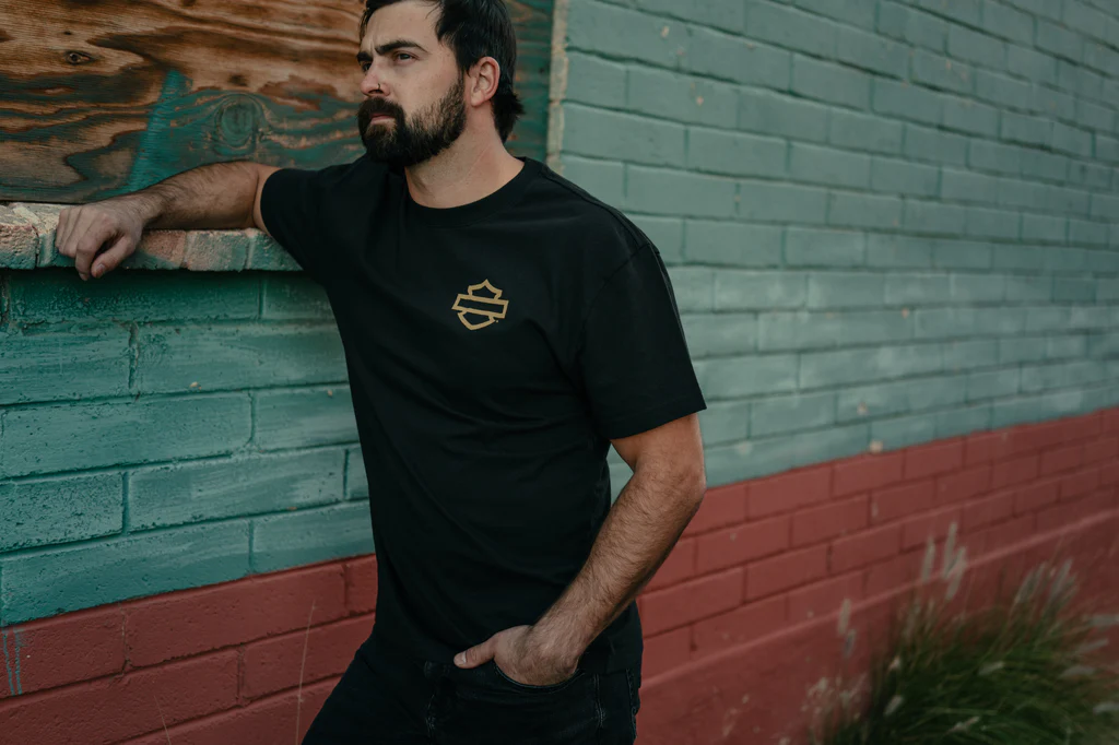 Questa maglietta a maniche corte unisex Harley-Davidson LFR Winged Skull è realizzata in jersey di cotone di medio peso al 100% per il massimo comfort e la massima resistenza. I dettagli in maglia a coste sullo scollo aggiungono un tocco di stile, mentre la grafica morbida e usurata stampata a mano crea un look audace e grintoso. Con l’iconica scritta “Let’s F*ing Ride”, questa maglietta è perfetta per ogni vero fan di Harley-Davidson.